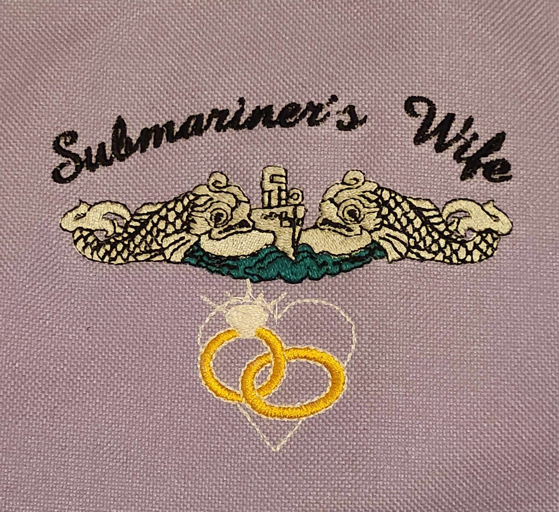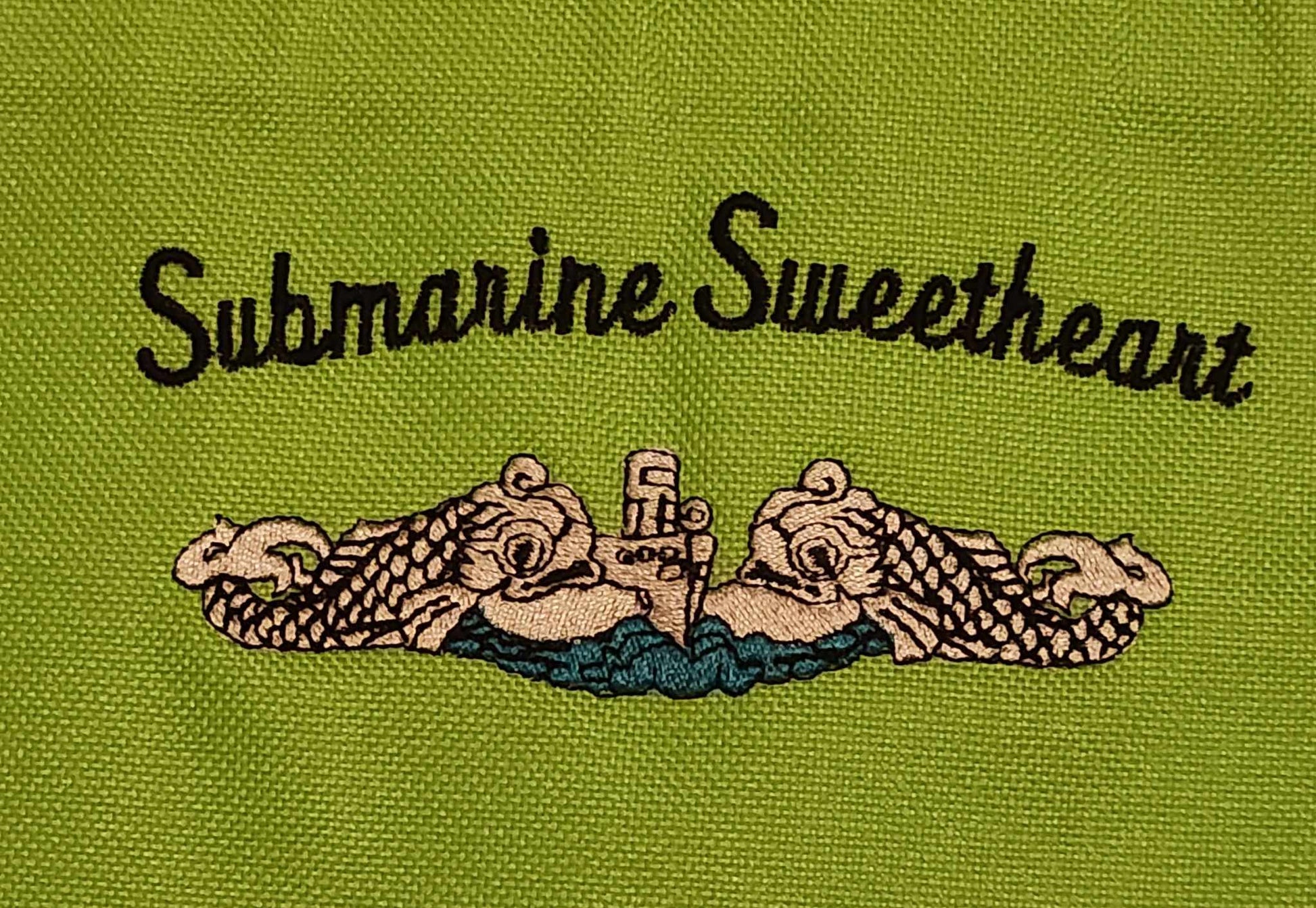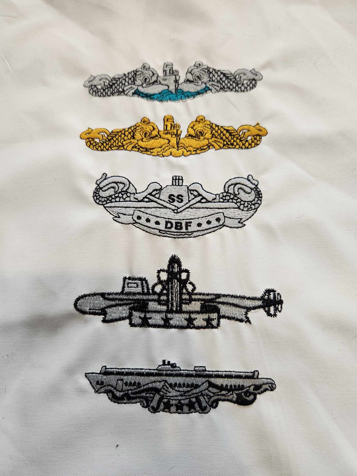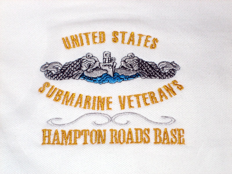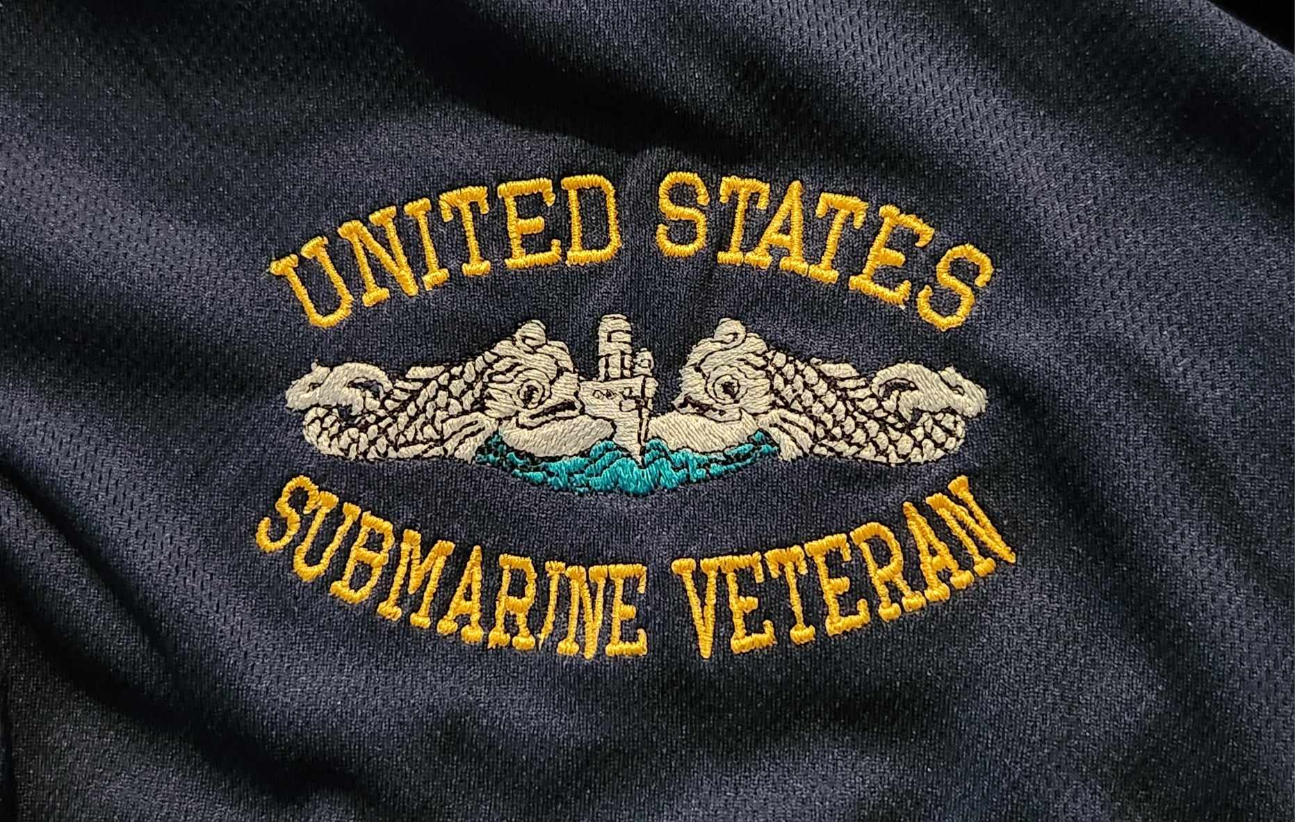 Price includes Left Chest Embroidery Of United States Submarine Veteran text and Dolphins.